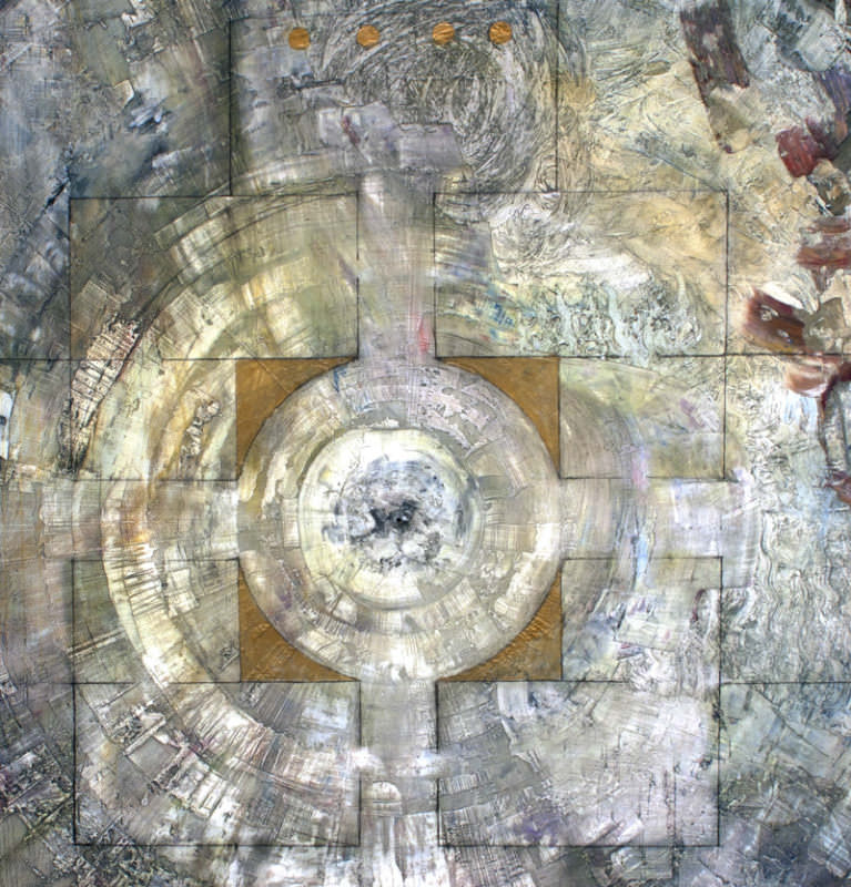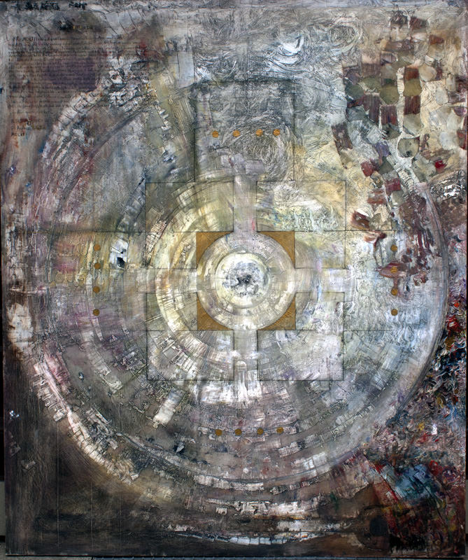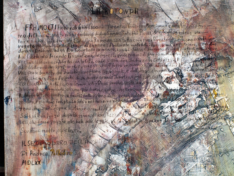 Die Abmessungen dieses Bildes könnten eigentlich nicht groß genug sein. Ideal wäre eine Verkleinerung des Grundrisses der Villa Rotonda des Palladio auf die Hälfte. Die Monumentalität des Bauwerkes würde durch das deutliche Hervortreten ihrer Maßverhältnisse leichter zu begreifen sein. Aber was hilft mir der Plan, wenn ich die sinnliche Überwältigung dieser Bravourleistung der Renaissancearchitektur physisch erleben will? Ich war vor Ort, habe alles gesehen und begangen, doch was kann eine Fotografie leisten, was können zwei Stunden im Bauwerk leisten? Die lebende haptische Materie ist es, diszipliniert durch die geordnete Materie des Planens, die die ausschweifende Kraft der Farbe und des Raumes bändigt. Ich habe den Kampf geführt mit der Grundform des Kreises, der duftenden Verführung der Ölfarbe und den Zuckungen des Hell-Dunkel-Kontrastes, habe Himmel und Hölle versucht und dabei jede Anstrengung unternommen um die Disziplin zu behalten. Ich wollte den Tiger „Palladio“ reiten und nicht von ihm gefressen werden. Am Ende schlich ich mich in Demut in eine Ecke und besah mein Werk mit Staunen und mit Freude. Es erneuert immer wieder meine unendliche Begeisterung für die Erlebnisräume komplexer Eleganz und Sinnlichkeit, die diese Epoche gezielt hervorzubringen verstand. Wie gern wäre ich dabei gewesen. Ein kleines Mäuschen, an Palladios Krumen naschend, die aus seinem Mantel fallen, während er seine Entwürfe in der warmen Abendsonne ausbreitet.